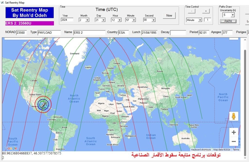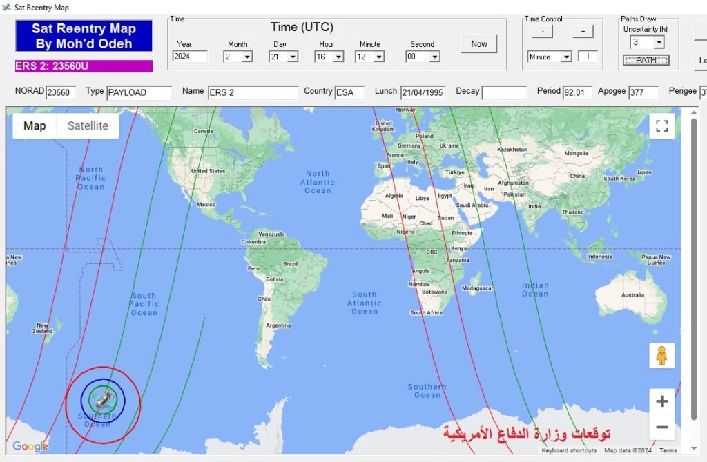 وتبين صورة القمر الصناعي على الخارطة موقع السقوط المتوقع بحسب هذا التحديث. وتبين الخطوط الحمراء والخضراء الأماكن التي سيمر القمر الصناعي فوقها خلال فترة احتمالية السقوط. وذلك بحسب توقعات “برنامج متابعة سقوط الاقمار الصناعية” كما هو مبين في الخارطة الأولى.