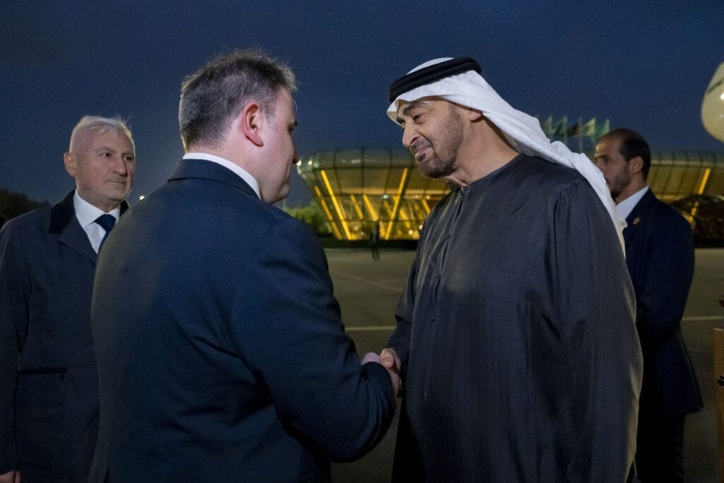 يرافق سموه، وفد يضم كلا من سمو الشيخ حمدان بن محمد بن زايد آل نهيان نائب رئيس ديوان الرئاسة للشؤون الخاصة، ومعالي الشيخ محمد بن حمد بن طحنون آل نهيان مستشار الشؤون الخاصة في ديوان الرئاسة، ومعالي الدكتور سلطان أحمد الجابر وزير الصناعة والتكنولوجيا المتقدمة، ومعالي محمد حسن السويدي وزير الاستثمار، ومعالي الدكتورة آمنة بنت عبدالله الضحاك الشامسي وزيرة التغير المناخي والبيئة، ومعالي أحمد بن علي الصايغ وزير دولة، ومعالي الدكتور أحمد مبارك المزروعي رئيس مكتب رئيس الدولة للشؤون الإستراتيجية في ديوان الرئاسة، ومعالي فيصل عبدالعزيز محمد البناي مستشار رئيس الدولة لشؤون الأبحاث الإستراتيجية والتكنولوجيا المتقدمة، وسعادة محمد مراد البلوشي سفير الدولة لدى جمهورية أذربيجان.