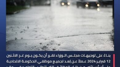 تقرر أن يكون يوم غدٍ الإثنين 12 فبراير 2024 عملاً عن بُعد لجميع موظفي الحكومة الاتحادية على أن تُستثنى من…